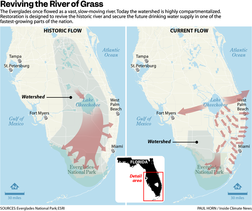 Over the intervening 25 years, the landscape across an 18,000-square-mile expanse, larger than the state of Maryland, has undergone an extensive reshaping. Hundreds of miles of canals have been backfilled, enormous new reservoirs excavated and water control structures blown up, all to restore a more natural flow of water where for more than a half century some of the most complex water management infrastructure in the world has allowed for the urban jungles of South Florida to flourish alongside the wild Everglades.