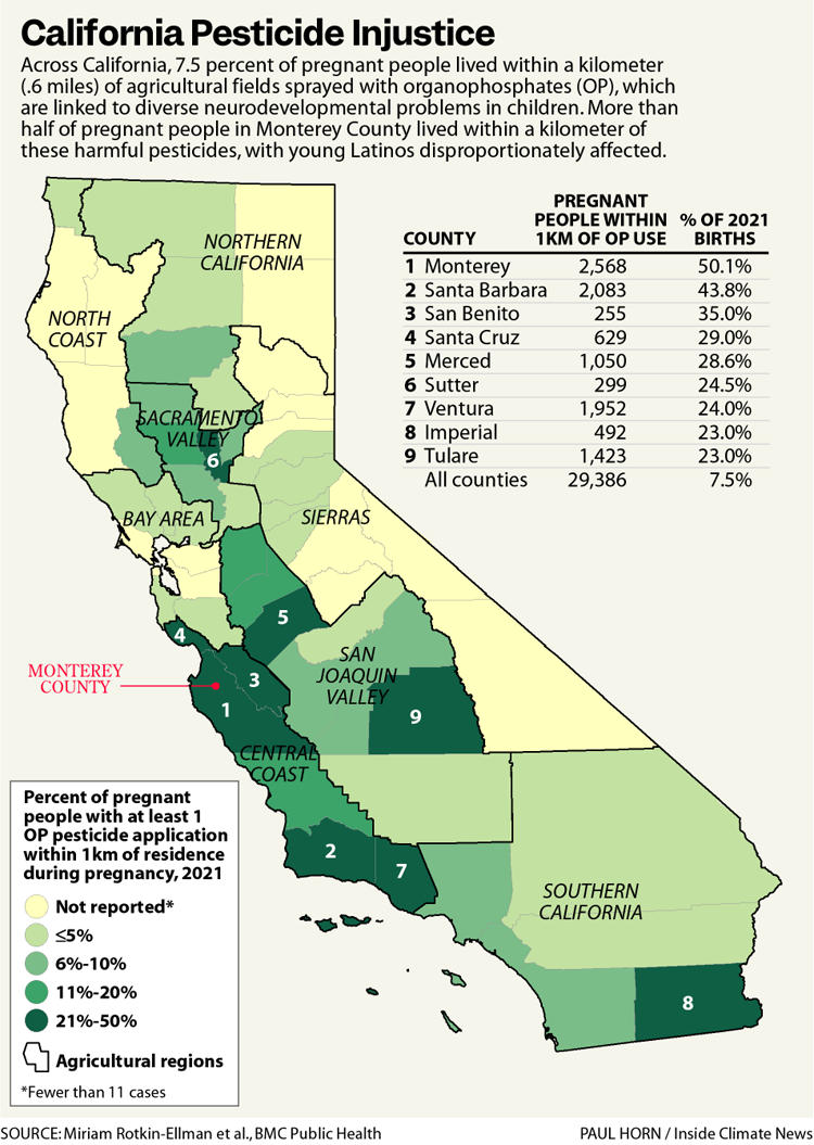 They found that only growers in the Central Coast increased organophosphate applications between 2016 and 2021, even as statewide use dropped by 54 percent. Monterey County boosted applications by 26 percent.