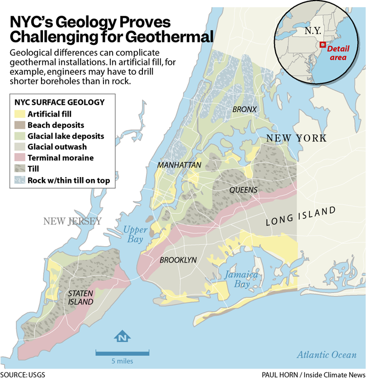 Installing geothermal systems in dense New York neighborhoods involves strict safety regulations and careful planning to avoid underground conflicts like subway or water tunnels. For existing properties, engineers must find suitable nearby space to drill into the ground.