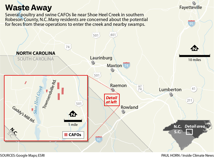 Shoe Heel Creek runs past the CAFOs and through the back half of Schwab’s 73-acre property before entering South Carolina. She is worried about the water quality in the creek and nearby swamps. Farmers legally spray and spread tons of poultry and hog waste from CAFOs onto their fields as fertilizer, which can seep into groundwater and waterways.