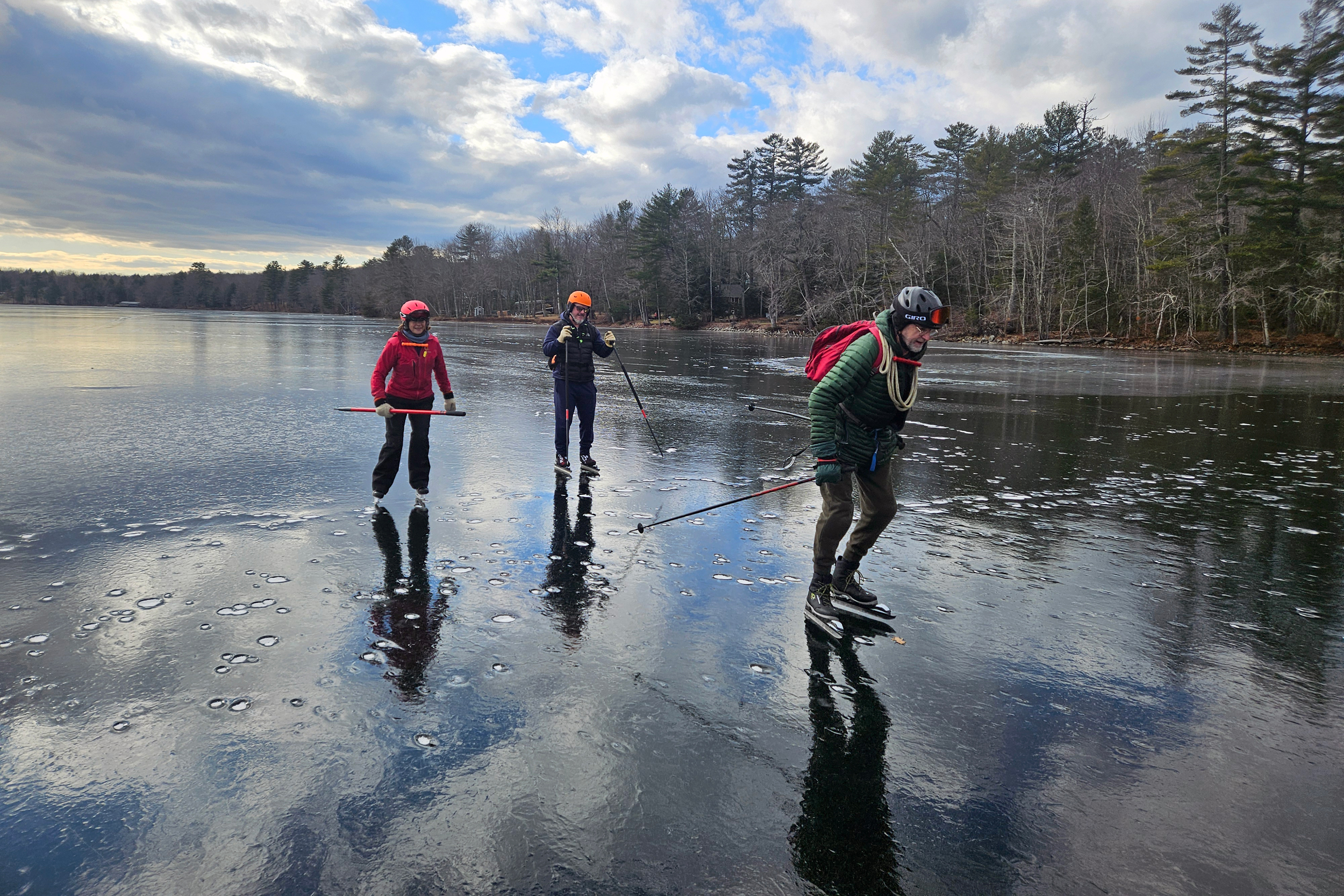 December 2025, for instance, set record-low temperatures in many parts of the state, which is a boon for skaters like Behr. But the 2023–2024 winter was one of the warmest in the state’s history. Taber said some lakes failed to ice over during recent warm winters. Several towns cancelled or moved their annual ice fishing derbies in 2023 and 2024 due to lack of ice cover.