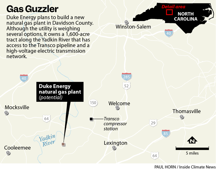 Large natural gas plants require hundreds of acres of land, which narrows Duke’s options. The North Carolina Electric Membership Corp. owns a 430-acre tract near the Transco natural gas compressor station northwest of Lexington that is large enough to accommodate such a facility.