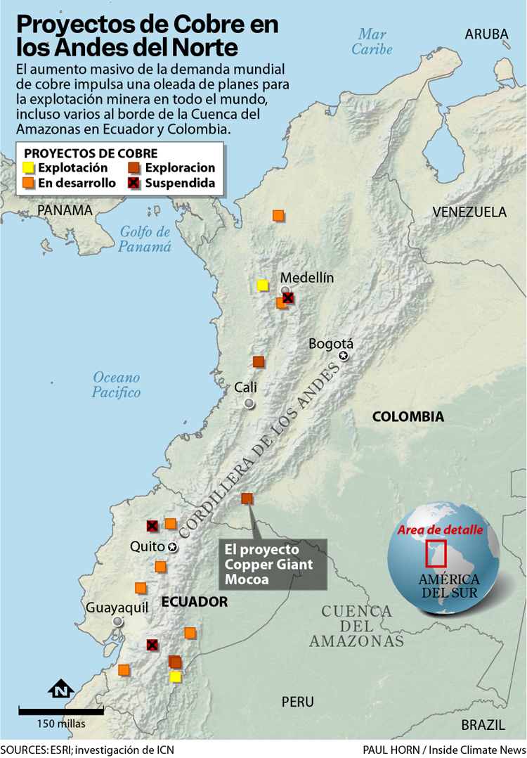 Lejos de Mocoa, a lo largo de los Andes de Colombia y Ecuador, casi una docena de proyectos de cobre están en exploración o desarrollo, incluso tres en el borde occidental de la cuenca amazónica, donde un accidente o desastre podría derramar desechos mineros en uno de los ecosistemas más importantes y amenazados del mundo.