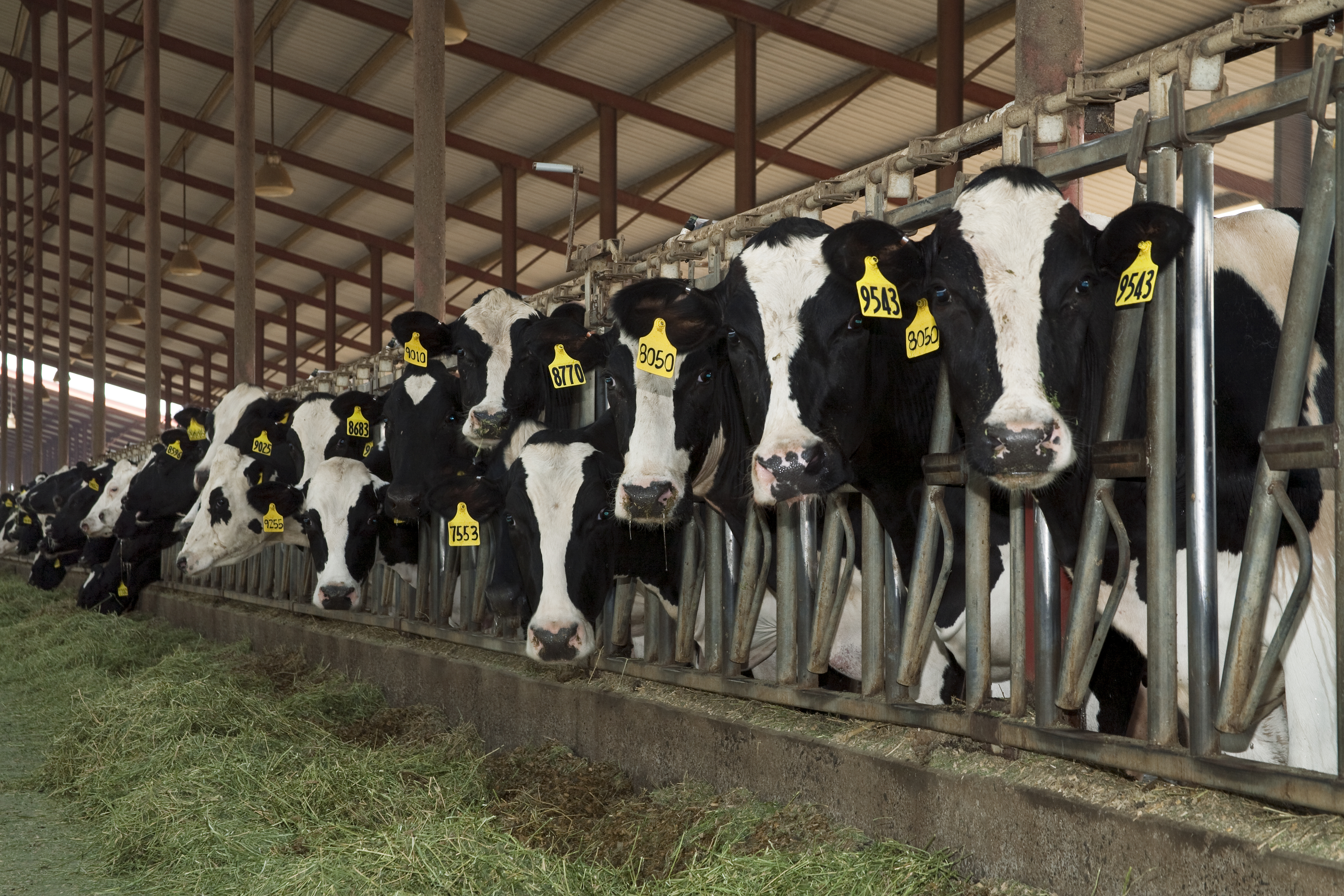 Curious Holstein dairy cows feed on silage in a freestall barn at a large California dairy / San Joaquin Valley, California, USA. (Photo by: Ed Young /Design Pics Editorial/Universal Images Group via Getty Images)