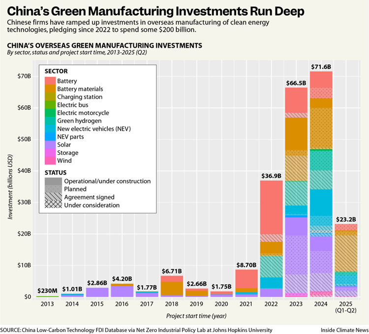 The exports are so large they’re moving the needle on global emissions, some experts say. China’s exports of clean energy goods—mostly solar panels but also batteries and other technology—cut out 220 million metric tons of climate pollution last year, roughly equal to Spain’s emissions, according to an analysis by Lauri Myllyvirta, a senior fellow at the Asia Society Policy Institute. If all the overseas clean energy manufacturing investments announced in 2023 and 2024 come to pass, that would mean an additional 130 million metric tons in annual emissions reductions, the analysis found.