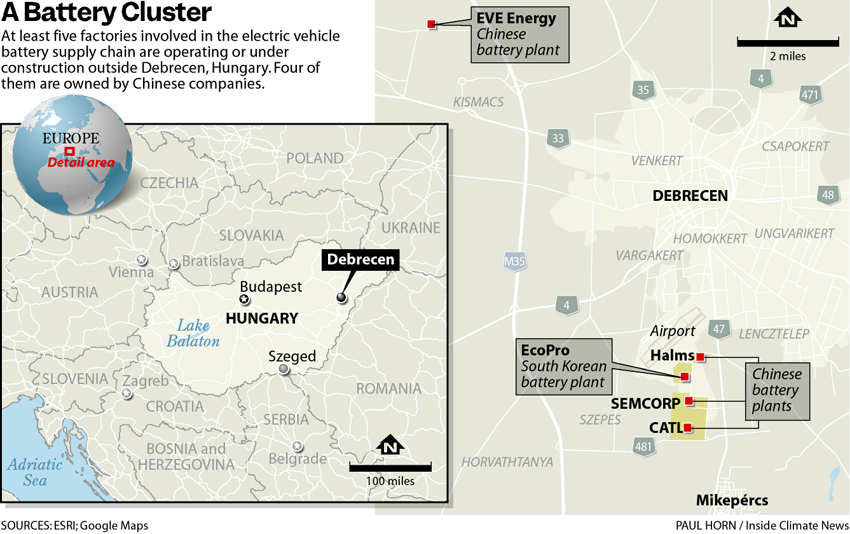 SEMCORP’s factory is one of at least four Chinese-owned electric vehicle battery-related factories operating or under construction outside Debrecen, Hungary. Credit: Nicholas Kusnetz/Inside Climate News