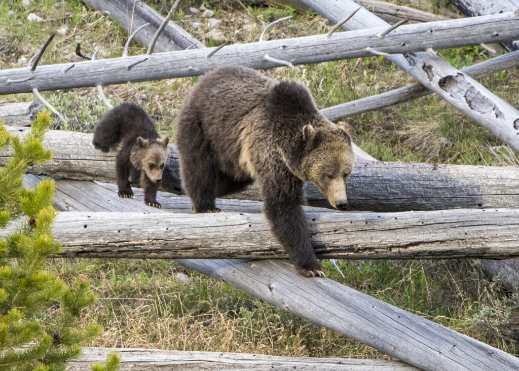 A mother grizzly bear and her cub climb over downed trees on June 6, 2024, in Yellowstone National Park, Wyoming. Credit: Jonathan Newton/Getty Images
