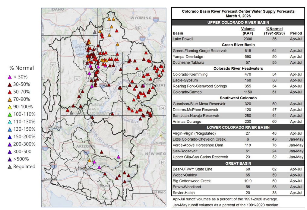 Cody Moser with the federal Colorado Basin River Forecast Center said last week just 2.3 million acre feet of Colorado River water is expected to reach Lake Powell through July. That’s about a third of what’s considered normal.
