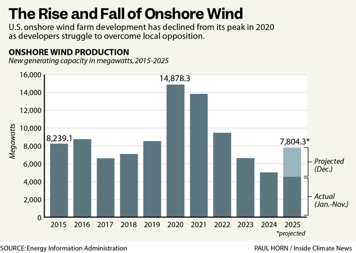 Wind energy development has all but ground to a halt in the face of community opposition, a phaseout of federal tax credits and the Trump administration’s actions to slow the approval of federal permits.
