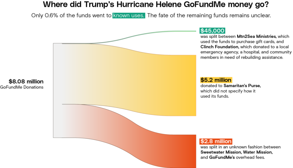 Trump was present to, among other things, deliver an update on a GoFundMe set up by his presidential campaign for those impacted by Helene. In three short weeks, the drive had raised $7.7 million from the pockets of ordinary Americans, prominent Republican political operatives, and some of the country’s most influential and wealthiest families.