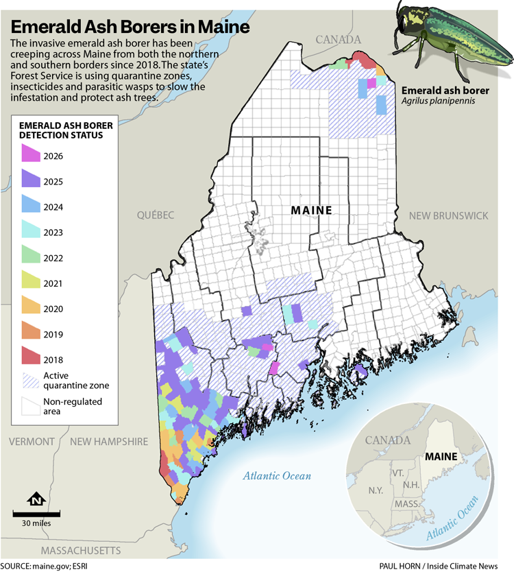 Nevertheless, the ash borer arrived in 2018, first crossing from New Brunswick across the northern border and then into the southern tip of the state from New Hampshire. As of 2025, the state Forest Service has found ash borers in nearly every county.