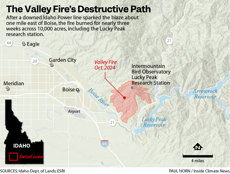 The Valley Fire torched Lucky Peak in the fall of 2024. Bird researchers there are channeling their grief into study of how avians respond to climate-driven blazes.